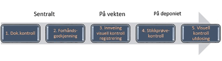 Avfallet skal være vurdert og godkjent før leveranse. Dokumentasjon skal sendes til NGm3 sentralt, hvor den gjennomgås av personer med høyere utdannelse, og dokumentasjon til godkjente prosjekter arkiveres i vektsystemet. Figuren under angir hvordan kontrollen fungerer for masser som tas imot ved våre massemottak. Dette er i tråd med avfallsforskriftens kap. 9 sine krav til mottakskontroll.